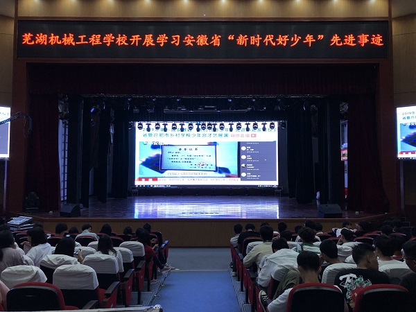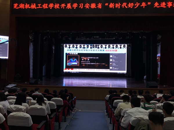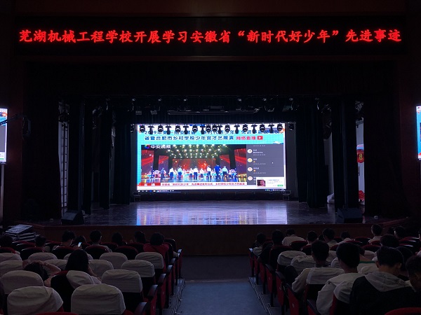 5月28日晚上,芜湖机械工程学校关工委、学生处组织住校生700多名学生观看2019年第一批安徽省“新时代好少年”先进事迹发布仪式、省暨合肥市乡村学校少年宫才艺展演。