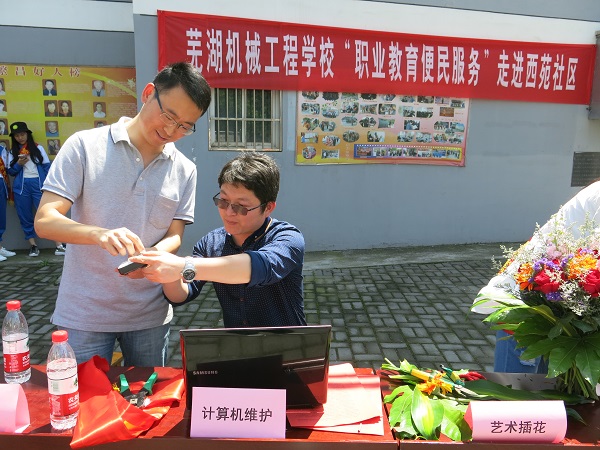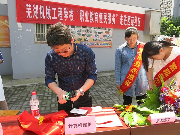 5月8日——14日,是全国“职业教育活动周”。芜湖机械工程学校在活动期间安排一系列的活动,5月12日上午,芜湖机械工程学校志愿者在西苑社区开展了“职业教育便民服务活动”,共派出了16名志愿者(教师6名,学生10名),面向社区居民开展了计算机维护、计算机软件安装、艺术插花、汽车维护与保养、环境卫生宣传多项便民服务。