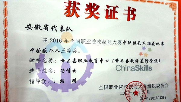 2016年5月15日,在江苏农林职业技术学院举办的全国职业院校技能大赛农林类赛项中职组艺术插花项目比赛中,芜湖机械工程学校(繁昌县职教中心)汤倩云同学在胡明老师精心指导下,一举斩获全国三等奖,填补了全国技能大赛安徽省在这个项目上的空白!