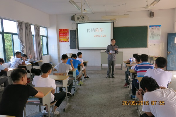 班会课中,各班班主任给本班学生讲解传销的违法犯罪性质、欺诈本质和严重危害,以提高学生识别传销的能力,并带领学生进行《禁止传销条例》、《直销管理条例》等法规条例的学习,加强对学生的思想教育和法制教育,提高全体学生的防范意识。