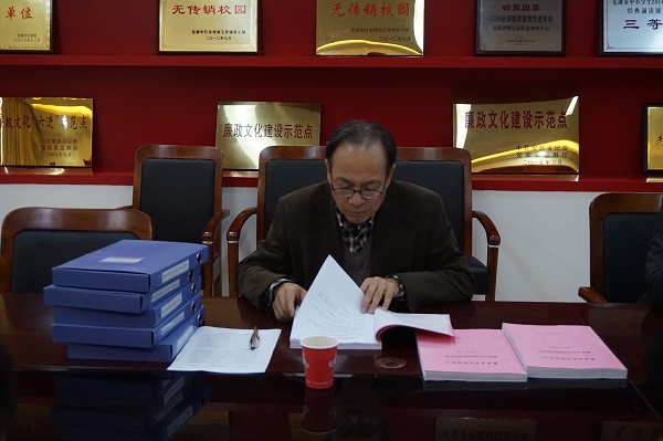 2016年11月1日,芜湖市纪委宣教室主任何平、副主任熊东升一行到芜湖机械工程学校,检查指导学校省级廉政文化示范点标兵创建工作。