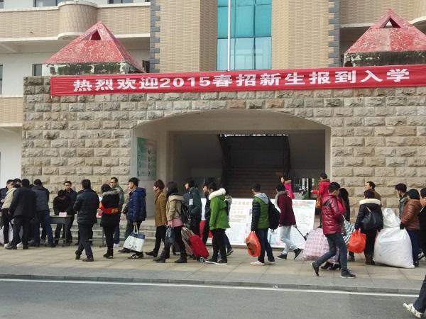 2015年元月16日下午,芜湖机械工程学校实训楼前车水马龙人来人往,身披绶带的引导员正在热情引领2015春招新生有序来到班主任(连队指导员)、军训教官处报到入学,并帮助同学们前往寝室办理入住手续,气氛热烈而又秩序井然。