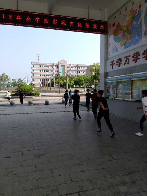 紧急疏散演练。学校成立防震减灾应急工作领导组,由政教处制定紧急疏散活动方案,班会课结束时,校园内警报信号响起,全校师生纷纷低头弯腰快步离开教室、办公室,跑步疏散到学校操场。整个疏散演练过程中,学生快速撤离有序,在较短的时间内全体师生全部撤离教学区。