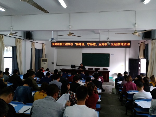 会上,副校长刘琳宣读了《芜湖机械工程学校开展“铸师魂,守师道,立师表”师德师风建设活动方案》,办公室印发了《问卷调查表》,全体教工认真学习,认真填写。
