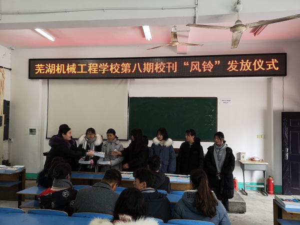 1月3日下午,芜湖机械工程学校第八期“风铃”校刊发放仪式在校阶梯教室举行,团委书记、各专业学部团总支书记及各班级团支部书记参加了活动,活动由校团委副书记卢寅主持。