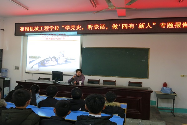 12月20日下午,县关工委邀请中共繁昌县委党校周慧敏在学校阶梯教室作题为《学党史,听党话,做‘四有’新人》教育专题报告。学校部分学生代表和县关工委两位领导、副校长张文健共计100余人参加了此次报告会,报告会由学校副校长张文健主持。