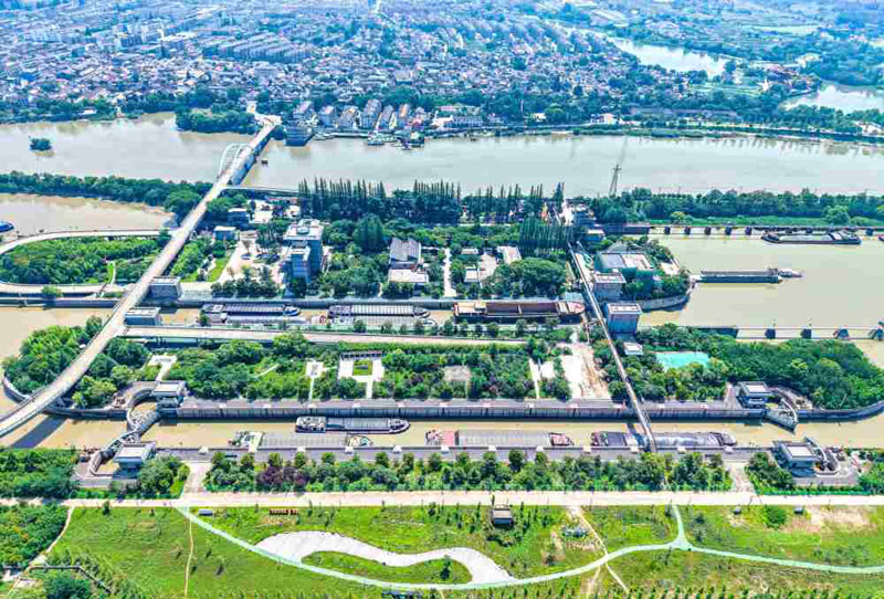 2025年7月4日,船舶有序通过京杭大运河扬州段邵伯船闸(无人机照片)。(新华社发 任飞/摄)