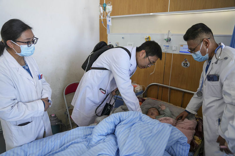 来自大连医科大学附属第一医院的援藏医生田聪亮(左二)和同事在西藏那曲市人民医院查房(2025年7月18日摄)。(新华社记者 晋美多吉/摄)