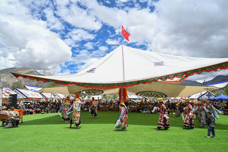 民间藏戏表演队在西藏南木林县非遗公园内表演湘巴藏戏(2025年7月16日摄)。(新华社记者 李鑫/摄)