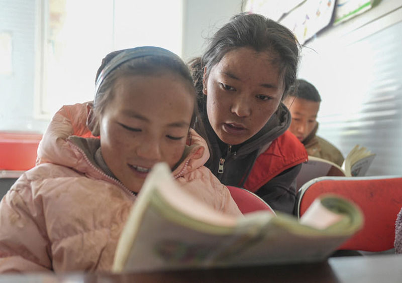西藏大学学生措姆在西藏定日县曲洛乡热木青村地震安置点为学生辅导作业(2025年1月25日摄)。(新华社记者 晋美多吉/摄)