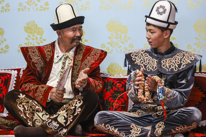 《玛纳斯》国家级非物质文化遗产代表性传承人江努日·图日干巴依(左)教徒弟演唱《玛纳斯》(2025年4月21日摄)。(新华社记者 王菲/摄)