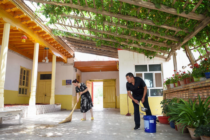 在新疆喀什地区疏附县阿亚格曼干村,村民阿卜都克尤木·肉孜(右)和妻子在打扫庭院(2022年6月10日摄)。(新华社记者 丁磊/摄)