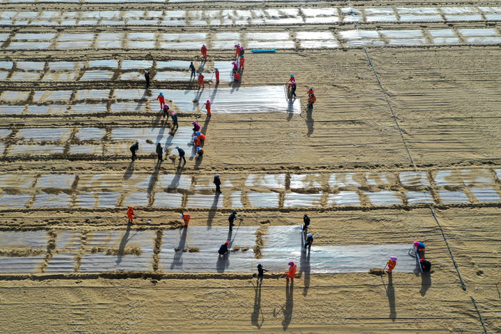 在新疆和田地区于田县沙产业实验基地,当地群众在种植薏米(2025年4月8日摄,无人机照片)。(新华社记者 丁磊/摄)