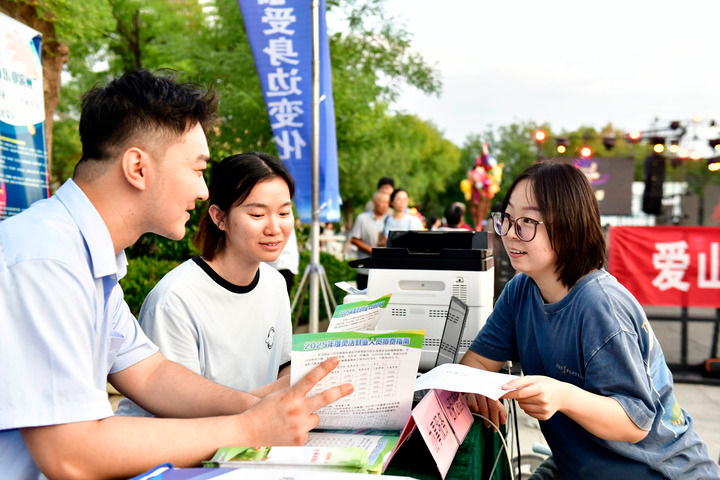 2025年8月25日,在山东省滨州市惠民县孙武广场,人社局的工作人员向市民介绍社保证明查询相关服务。(新华社记者 郭绪雷/摄)