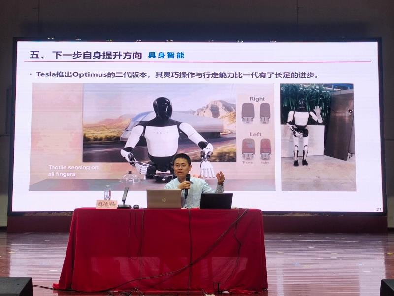讲座中,周俊锋结合自身经验,分享了职场实用技能。他以“如何写简历”“如何组织会议”“如何编写汇报材料”等案例为切入点,强调“逻辑清晰、重点突出”的沟通能力是职业发展的基石。此外,面对智能制造浪潮,周教授提出“具身智能”将是未来工业的关键方向。他介绍了特斯拉Optimus、Figure 01等前沿技术。他鼓励学生:“一个人的时间花在哪里,成果就出在哪里。保持学习力、行动力和健康力,才能应对未来变革。”