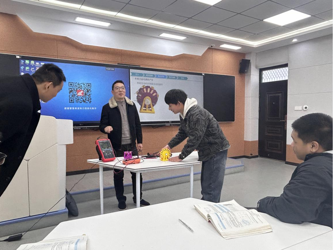 第二节公开课由蒋自文老师主讲,主题为“三相交流电的产生”。针对“电磁感应、相位差”等抽象难懂的知识点,蒋自文老师摒弃传统理论讲授的模式,以“工业发电原理”为切入点,通过短视频展示火力发电站机组运行场景,激发学生探究兴趣,自然融入课程思政。