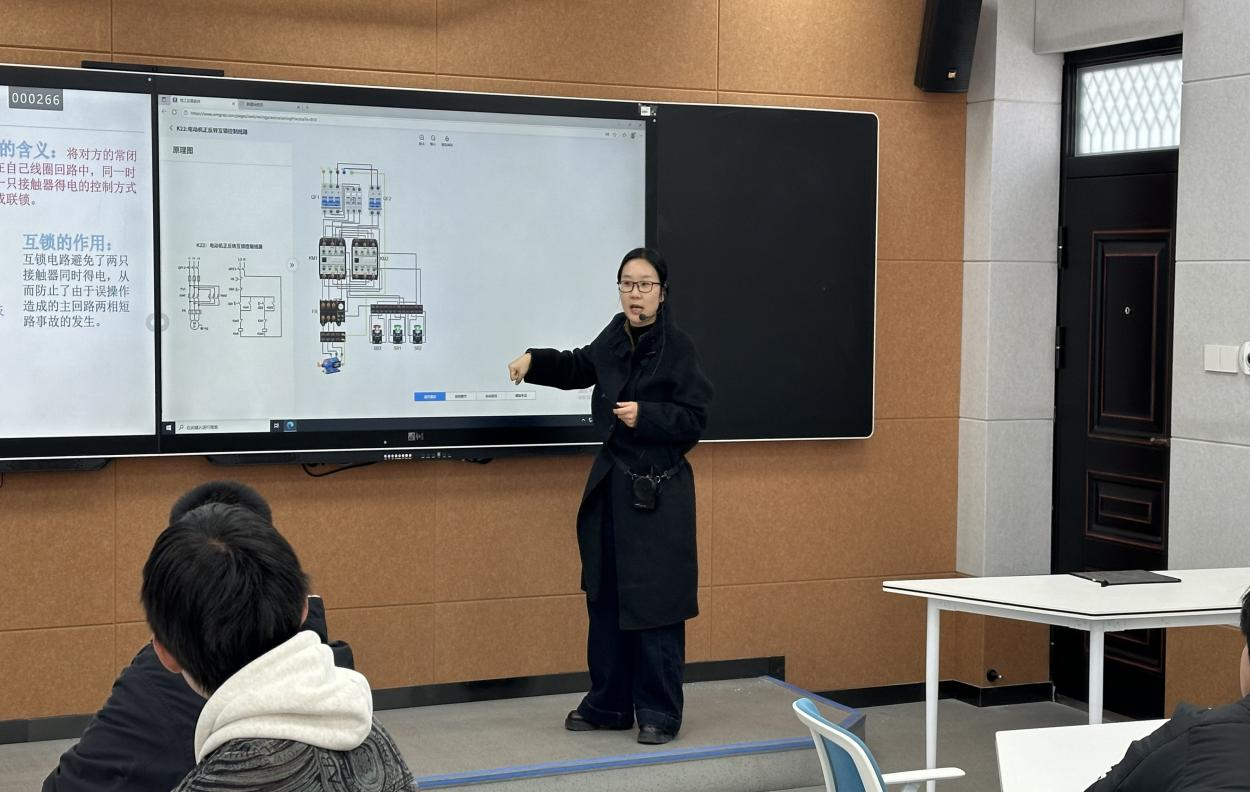 教学过程中,蒋丽萍老师引入电路仿真软件辅助教学,通过课堂一体机实时演示电路工作全过程:从主电路、控制电路的接线设计,到接触器线圈通电后触点的吸合动作,再到电机正反转切换时的电流流向变化,均以动画形式清晰呈现,充分展现了数字化资源。