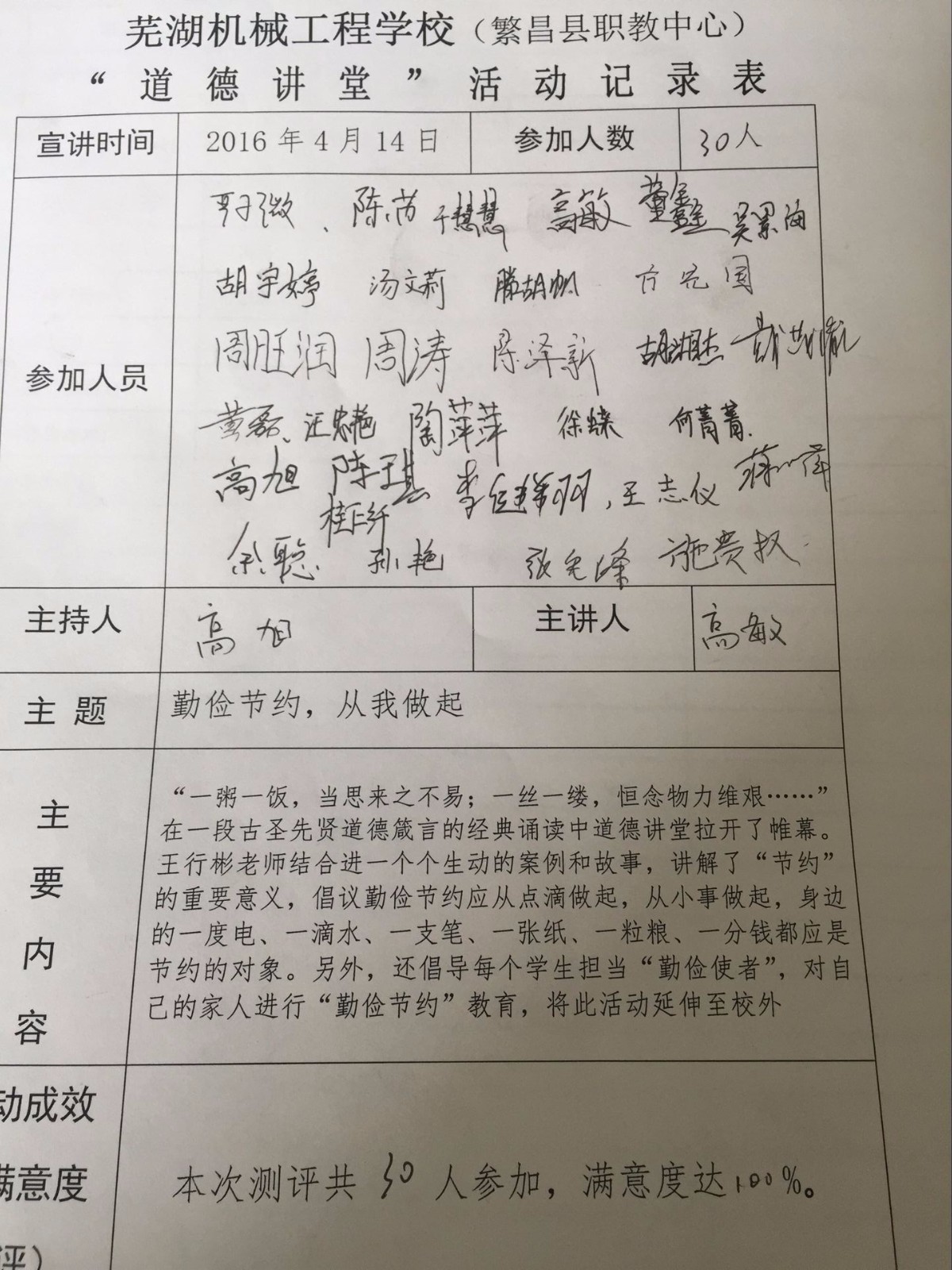 为了培养学生良好行为习惯,教育学生把勤俭节约落实到平时的生活中,2016年4月14日下午,芜湖机械工程学校学生高旭、高敏两们同学带来“勤俭节约,从我做起”为主题的道德讲堂。