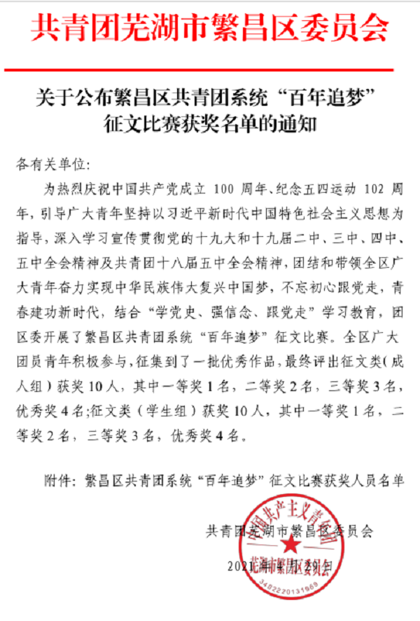 为热烈庆祝中国共产党成立100周年、纪念五四运动102周年,引导广大青年坚持以习近平新时代中国特色社会主义思想为指导,深入学习宣传贯彻党的十九大和十九届二中、三中、四中、五中全会精神及共青团十八届五中全会精神,团结和带领全校广大青年奋力实现中华民族伟大复兴中国梦,不忘初心跟党走,青春建功新时代,结合“学党史、强信念、跟党走”学习教育,芜湖机械工程学校按照上级文件要求开展了“百年追梦”征文比赛。