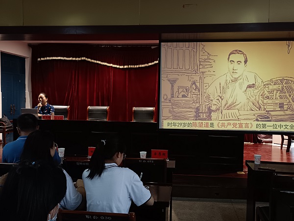 活动是由区委党校陈冬梅老师为学生带来的一场以“陈望道首译《共产党宣言》及其历史影响”为主题的宣讲。陈老师从“陈望道首译《共产党宣言》的背景及过程”及“首译《共产党宣言》的历史影响”两个问题入手,学习陈望道等老一辈共产党人敬业忘我的工作精神、对共产主义理想的坚定信念以及对真理的执著追求。“心有所信,方能行远”,“知史爱党、知史爱国”,带领团员青年进一步学习了《共产党宣言》,从首次翻译《共产党宣言》的历史影响发散到马克思主义中国化的最新成就,深刻体悟习近平新时代中国特色社会主义思想的深刻内涵。