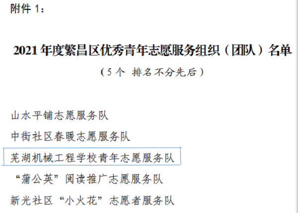 3月2日,团区委、区文明办联合组织开展2021年度“繁昌区优秀青年志愿者”“繁昌区优秀青年志愿服务组织(团队)”表彰活动在大润发举办,我校青年志愿服务队荣获“2021年度繁昌区优秀志愿服务组织”荣誉称号。
