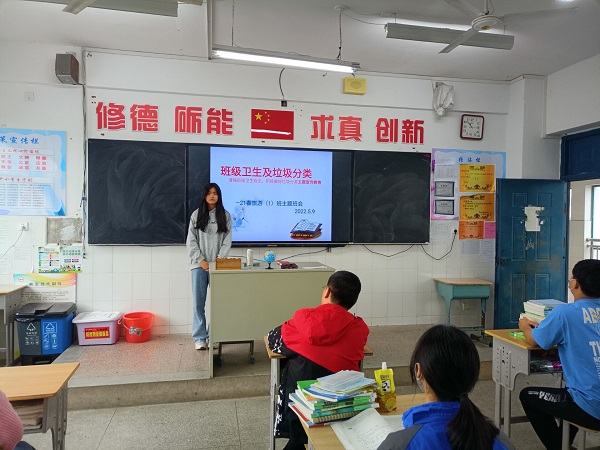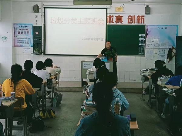 各班级利用主题班会,广泛宣传垃圾分类知识,积极引导学生主动参与生活垃圾分类宣传实践,自觉落实好生活垃圾减量化、资源化、无害化的可持续发展目标。让学生们认识什么是生活垃圾、为什么要垃圾分类、垃圾分类的方法及处理体系、垃圾分类督导员工作职责等。