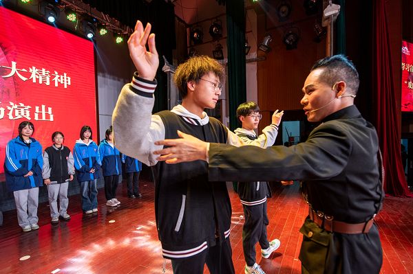 表演结束后的互动环节,同学们热情高涨,9名同学走上舞台,在专业黄梅戏演员的指导下,学习“唱、念、做、打”的传统戏曲知识,有模有样地学习表演了《天仙配》选段,现场欢笑声不断,通过此次“沉浸式”体验,师生们与传统艺术更加亲近了。