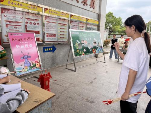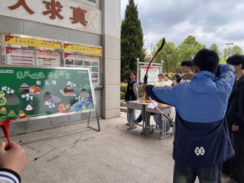 本次活动开设了射“五毒”和投壶两个比赛项目。射“五毒”是中国传统端午习俗,民间流传,五月初五是毒月毒日,古人便印画五种毒虫,用弓箭石子击打,以求安宁。在A楼一楼走廊上,摆放着张贴了“五毒”图案的展板,同学们屏气凝神、张弓搭箭。投壶不仅是端午节的传统习俗,还代表了一种礼仪,出自儒家六艺中的“射”礼,同学们体验投掷乐趣、延承古代礼仪。乘着仲夏的柔风,学生们各个铆足了劲,比赛精彩之处,现场传来阵阵掌声和欢呼声。整场活动高潮迭起、精彩纷呈。同时,现代艺术部精心为同学们准备了艾草香囊、五彩编绳、粽形抱枕等充满节日氛围的礼品,大家收获满满。