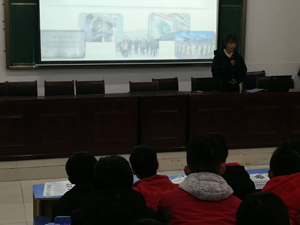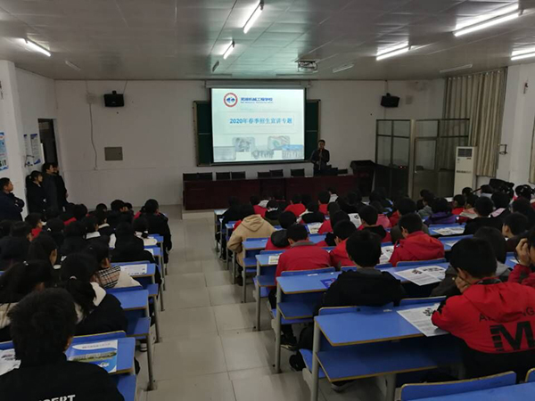 活动分三项进行。首先,向到场的全体师生发放《芜湖机械工程学校2020春季招生简章》并播放《芜湖机械工程学校宣传片》,全体师生通过招生简章及宣传片对芜湖机械工程学校有了大致的了解;其次,详细介绍环节由戴茂胤主讲,他从学校的办学特色、国家对中职学生的资助政策、对口升学、技能就业、技能大赛以及解读2019年国家及安徽省相继出台的关于职业教育改革实施方案等几个方面做详细的介绍,同时展示学校近三年来对口升学及技能大赛所取得的成绩,让学生对芜湖机械工程学校有了深入的了解。最后,由原新港初中毕业的胡丹丹和盛佳琪两位同学分别从对口升学、技能大赛两个方面谈谈他们在校学习、生活的基本情况,通过他们的介绍让全体师生对在芜湖机械工程学校就读有了直观的认识。整个宣传活动会场气氛融洽,达到了预期的宣传效果。