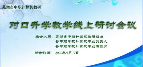 为进一步推进芜湖市中职计算机对口升学课堂教学研究,深化教学内容和教学方法,搭建校际间教学经验交流平台。根据本学期芜湖市中职计算机专业教研计划安排,9月17日下午,市教科所组织开展全市中职学校计算机对口升学教学研讨活动。因常态化疫情防控的需要及探索校际之间教研活动开展的新模式,此次活动借助“腾讯会议”平台采取线上研讨形式进行。市教科所郭勤老师、市中职计算机教研组组长、各中职学校计算机专业负责人以及专业课教师参加此次活动,活动由芜湖机械工程学校戴茂胤主持。