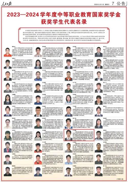 2023-2024学年度国家奖学金获奖学生代表名单近日公布。《人民日报》选登了其中100名研究生国家奖学金获奖学生优秀代表、100名本专科生国家奖学金获奖学生优秀代表和100名中等职业教育国家奖学金获奖学生优秀代表名录。