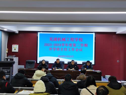 2月22日上午九点,芜湖机械工程学校校党支部书记、校长刘琳,校教务处主任凌忠卫,总务处主任徐强,学生处副主任钱成龙,三个学部分管德育主任及全体班主任齐聚学校阶梯教室,召开校2024年春季学期第一次班主任工作会议。会议由学生处主任蒋丽萍主持。