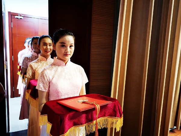校国学礼仪社团自接到参加县工会第十七次代表大会颁奖工作的通知后,在校领导的重视下,国学礼仪指导教师卢寅,从自身加强思想认识,不断利用礼仪课及课外时间加强学生的训练工作,从学生的整体形象、走姿要求、面部仪容仪表等方面提出高质量要求。通过活动中学生的展示,进一步宣传了学校,也展现了师生的风采。