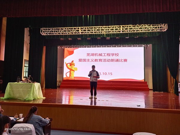 为了激发学生的爱国之情和作为中国人的自豪感,同时陶冶中职学生的艺术情操,提升普通话的普及程度,展示青春活力,营造朝气蓬勃、积极向上的校园文化氛围,芜湖机械工程学校以推普活动为契机,认真组织推广普通话活动,推动学校语言文字工作向纵深发展。10月15日下午在多功能报告厅举办了芜湖机械工程学校爱国主义教育朗诵比赛。朗诵比赛各班级学生们踊跃报名,积极参与,朗诵展示可谓精彩纷呈,令人目不暇接。