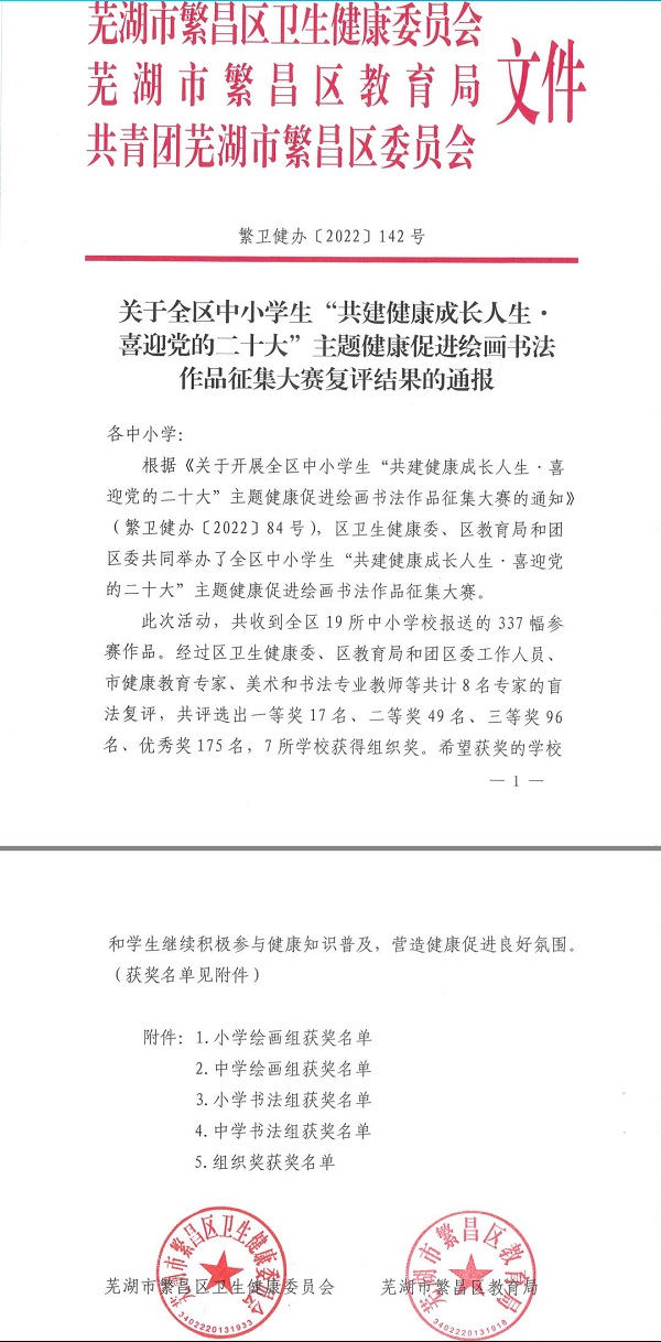 按照繁卫健办(2022)84号文件要求,为深入贯彻落实习近平总书记强调的“没有全民健康,就没有全面小康”精神,全面推进学校加强健康促进工作,校团委经过精心指导,推荐了9幅书画作品在参加全区健康促进书画作品征集大赛中全部获奖。