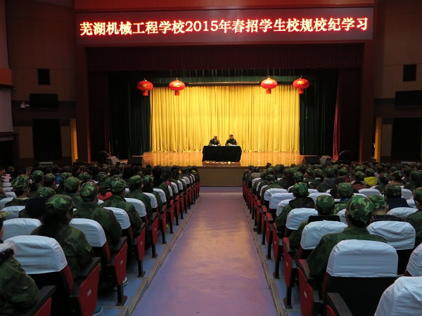 2015年元月17日晚上,芜湖机械工程学校政教处根据军训总指挥部安排,在校多功能报告厅召开2015春招学生校规校纪学习会议。会议由政教处主任俞晓勇主持,相关领导、全体参训教官、辅导员、工作人员参加。