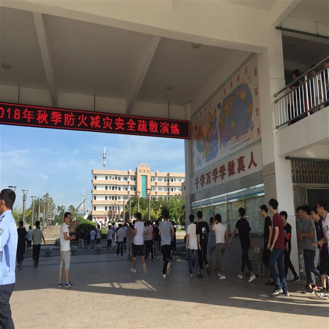 开展消防安全应急疏散演练活动。校成立消防安全应急工作领导组,由学生处制定防火减灾紧急疏散活动方案,班会课下课时,校园内警报信号响起,全校师生纷纷低头弯腰快速撤离教室、办公室,按照事先制定的逃生撤离路线紧急疏散到学校操场。