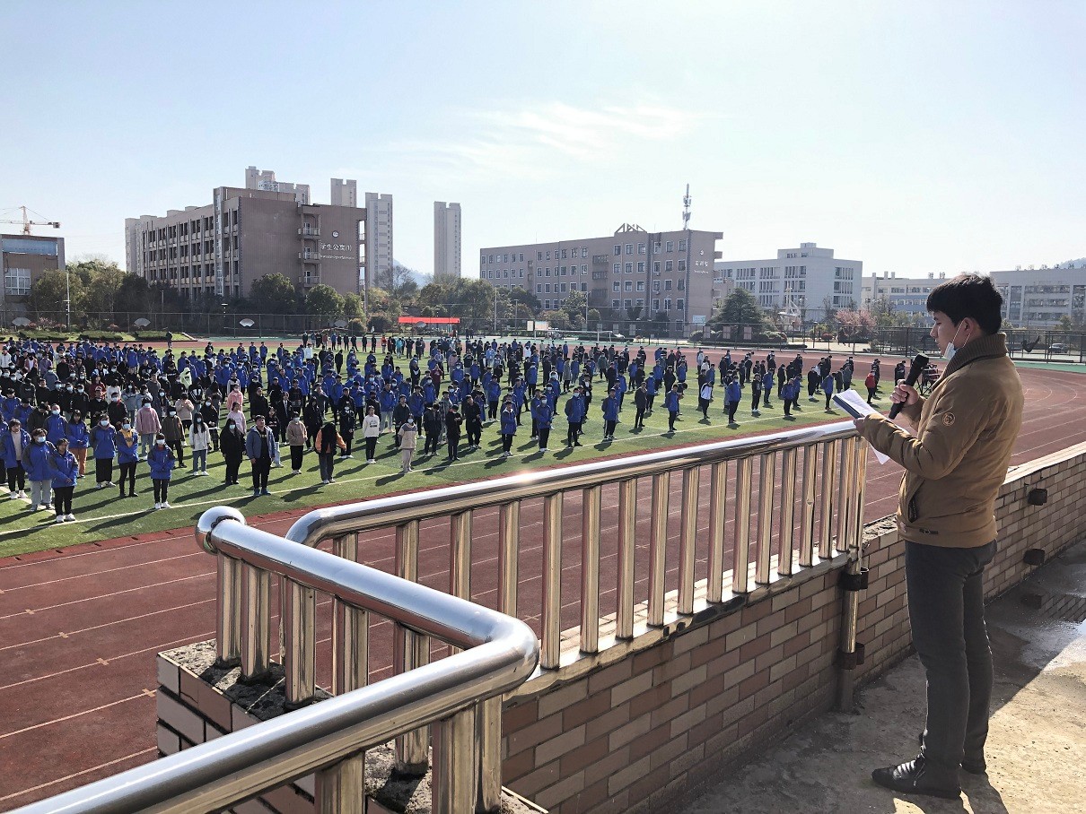 然后是旗下讲话,校团委书记钱保安向全体师生倡导爱国卫生运动,做好校园垃圾分类工作和个人卫生。通过勤洗手、常通风、多喝水、多锻炼等方式预防春季传染病的发生,并强调疫情常态化工作中也要做到早发现、早报告、早治疗,确保师生们的身体健康。