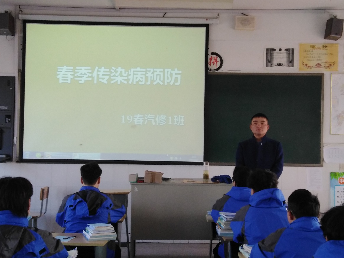 首先是各班级召开主题班会,班会课上班主任通过早已准备好的多媒体课件,播放常见春季传染病的案例和图片,向学生们介绍春季常见的传染病种类,传播途径及预防措施。