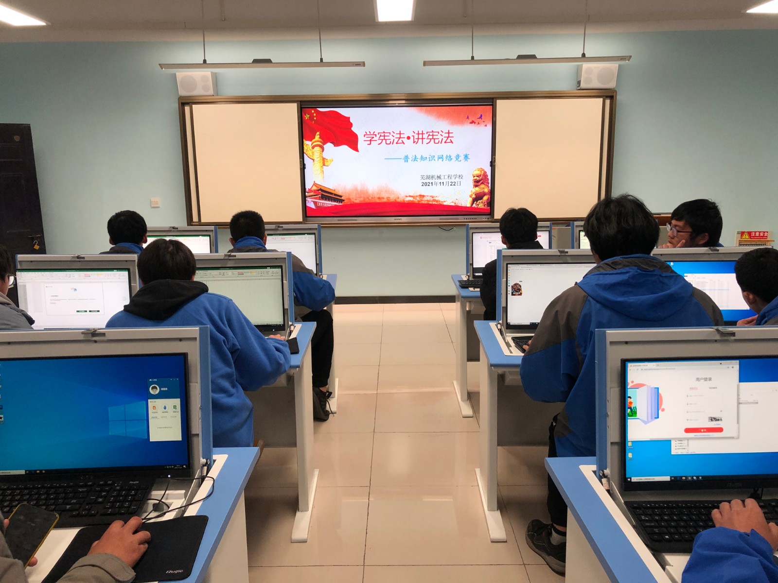 为普及宪法知识,进一步增强广大师生的宪法意识,11月22日,芜湖机械工程学校组织学生在信息楼机房开展普法知识网络竞赛活动。