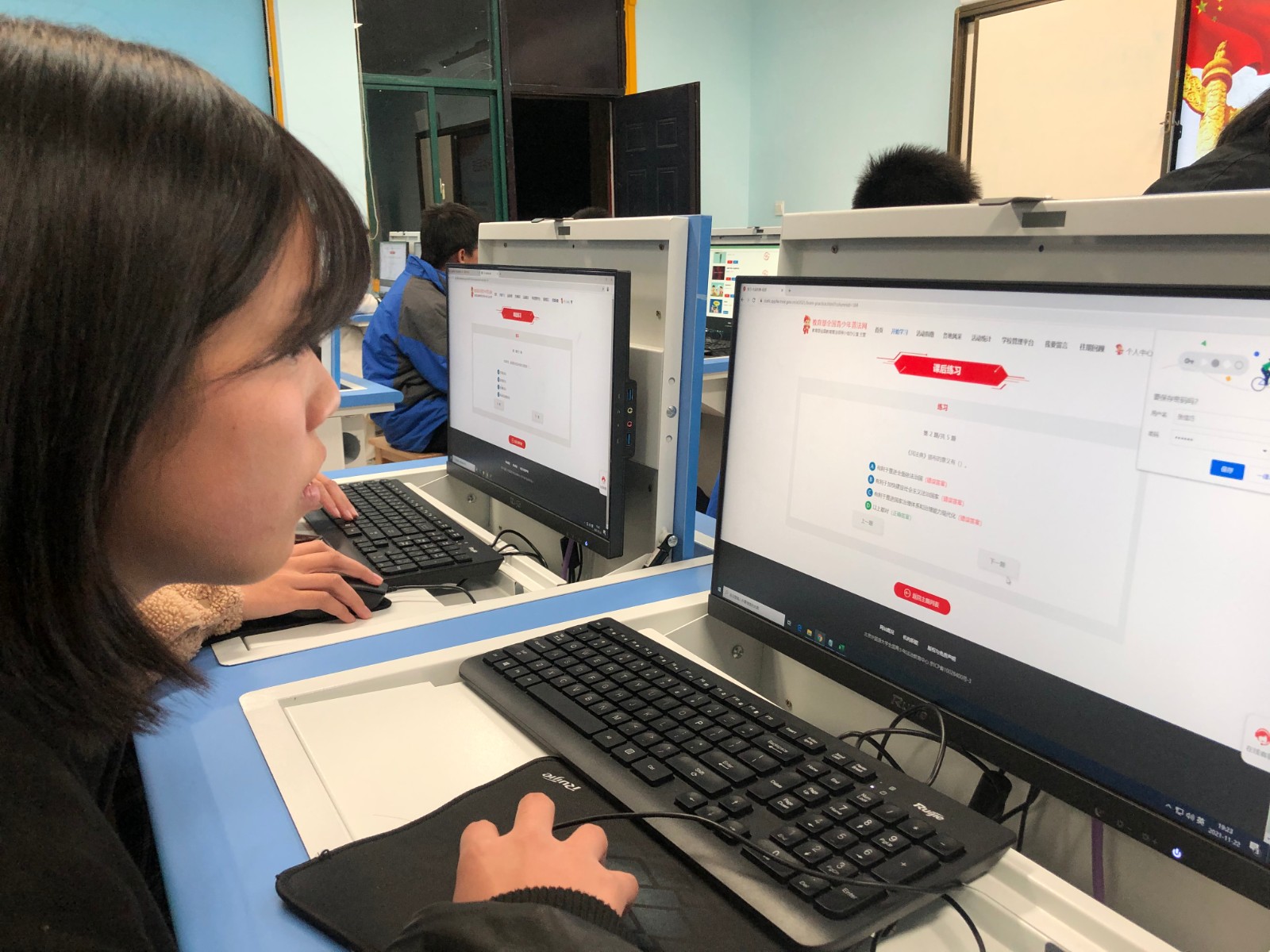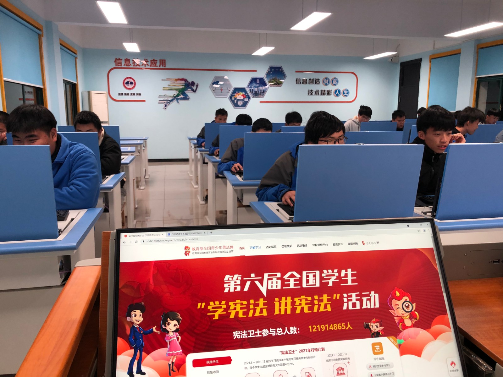 竞赛中,学生先进入“宪法学堂”课程,学习和自己切身相关的法律法规和《宪法》常识。通过普法知识测试,全体学生学到了《劳动法》、《服兵役》、《民典法》、《宪法》等普法知识,接受了一次深刻的法治教育。