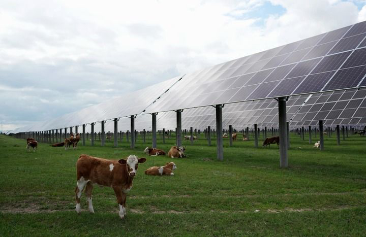 牛群在河北省围场满族蒙古族自治县御道口镇附近的一处“牧光互补”光伏发电场吃草(2024年7月25日摄)。(新华社记者 杨世尧/摄)