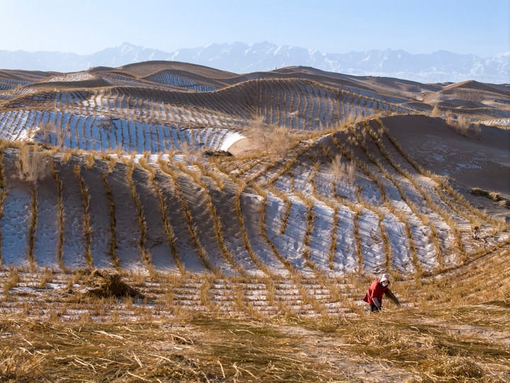 施工人员在甘肃省酒泉市阿克塞哈萨克族自治县的库姆塔格沙漠铺设沙障(2025年12月13日摄,无人机照片)。(新华社发 高宏善/摄)