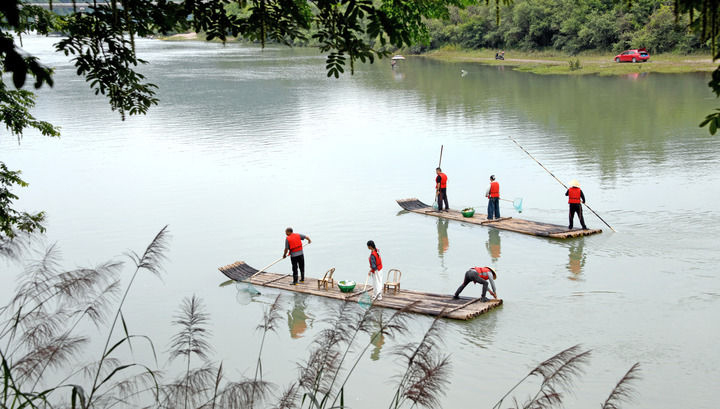 浙江省台州市仙居县步路乡党员志愿者与河长一起在永安溪巡河护水(2024年6月4日摄)。(新华社发 王华斌/摄)