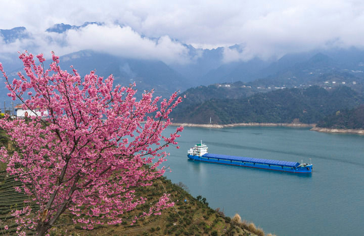船舶行驶在鲜花盛开的长江三峡西陵峡湖北省宜昌市秭归县水域(2026年3月3日摄,无人机照片)。(新华社发 郑家裕/摄)