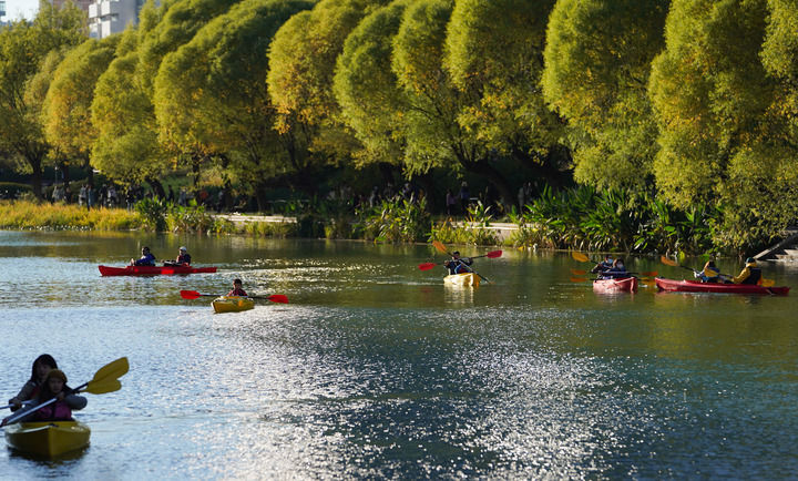 市民在北京亮马河上体验皮划艇(2022年10月22日摄)。(新华社记者 陈钟昊/摄)