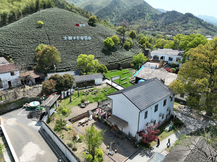 在浙江省安吉县上墅乡上墅村,茶山和一个乡村文旅项目结合在一起(2024年4月9日摄,无人机照片)。(新华社记者 翁忻旸/摄)