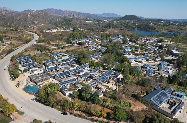 河北省平山县西柏坡镇北庄村兆瓦级“光储”智能微电网示范工程项目中的屋顶光伏发电板(2025年11月2日摄,无人机照片)。(新华社记者 杨世尧/摄)