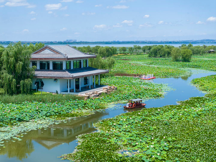 山西省长治市漳泽湖国家城市湿地公园一景(2025年7月5日摄,无人机照片)。(新华社发 孙兵兵/摄)