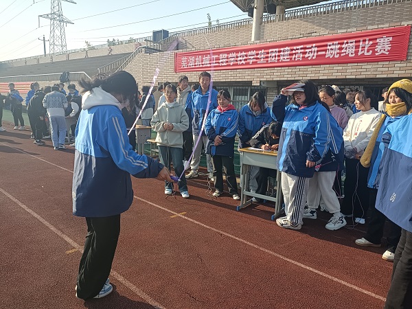 活动中选手们双手拿着跳绳,静静的等待比赛的开始。参赛的选手在场上跳跃着双脚,挥动着双臂。脚尖与地面的摩擦谱出一曲“动听的乐章”,手中的跳绳在空中舞出一条优美的弧线,场下的同学都为他们呐喊加油。比赛结束按照参赛人数60%评出了一、二、三等奖。